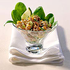 Beleg de coupes met een mooi slablaadje, verdeel het mengsel over de coupes, leg er een schijfje gecanneleerde citroen bij, een beetje paprikapoeder en het peterselieblaadje.