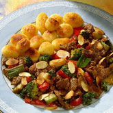 Bak de broccoli, bosui en paprika al omscheppend in 3 minuten knappend gaar. Voeg de biefstukplakjes en het cognacmengsel toe en verwarm het gerecht al omscheppend op hoog vuur tot het vocht verdampt is. Breng op smaak met zout en peper. Strooi de amandelen erover.