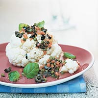 Bloemkool op schaal leggen en olijvensaus over de bloemkool schenken.