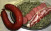Met prei en bacon: Bak 4 plakken bakbacon knapperig in 25 g boter en roerbak 300 g panklare prei in het bakvet. Meng de prei met 10 fijngehakte Amsterdamse uitjes, 2 eetlepels paprikasalade (potje)en wat mosterd door de stamppot. Leg de bacon er samen met de worst op.