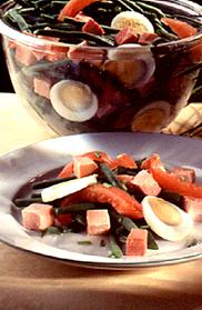 Tip: bij deze salade kunnen ook enkele gaargekookte en in plakken gesneden aardappelen worden toegevoegd.