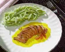 Snijd de eendenborstfilet schuin in stukjes. Schep de saus in het midden van voorverwarmde borden en leg de filetplakjes als een waaier in de saus. Garneer eventueel met een bergje geblancheerde taugé en partjes kerstomaat.